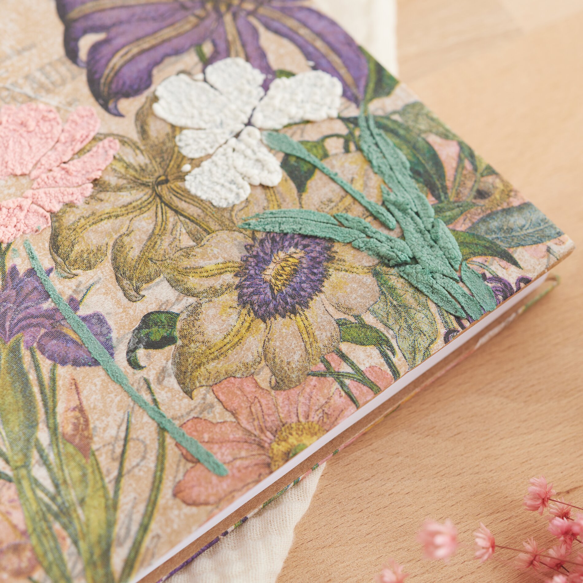Voor een bijzonder indrukwekkende afwerking kun je de gedroogde mousse verwarmen met een embossingdroger. De warmte zorgt ervoor dat de mousse opzwelt en een fascinerende schuimachtige textuur vormt. Het effect is niet alleen visueel aantrekkelijk, maar geeft je notitieboek ook een heel speciaal gevoel.