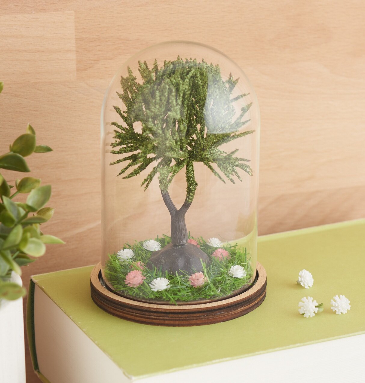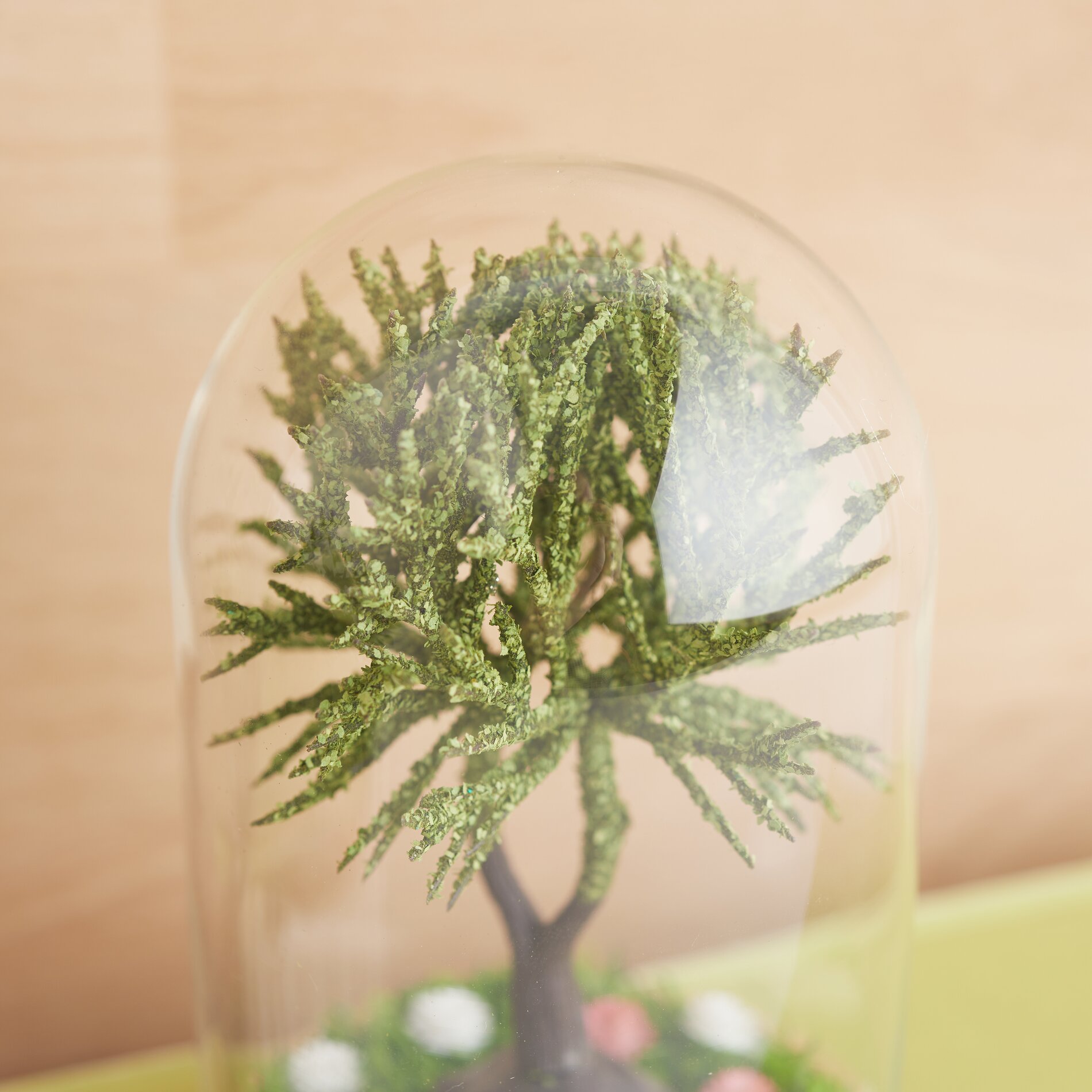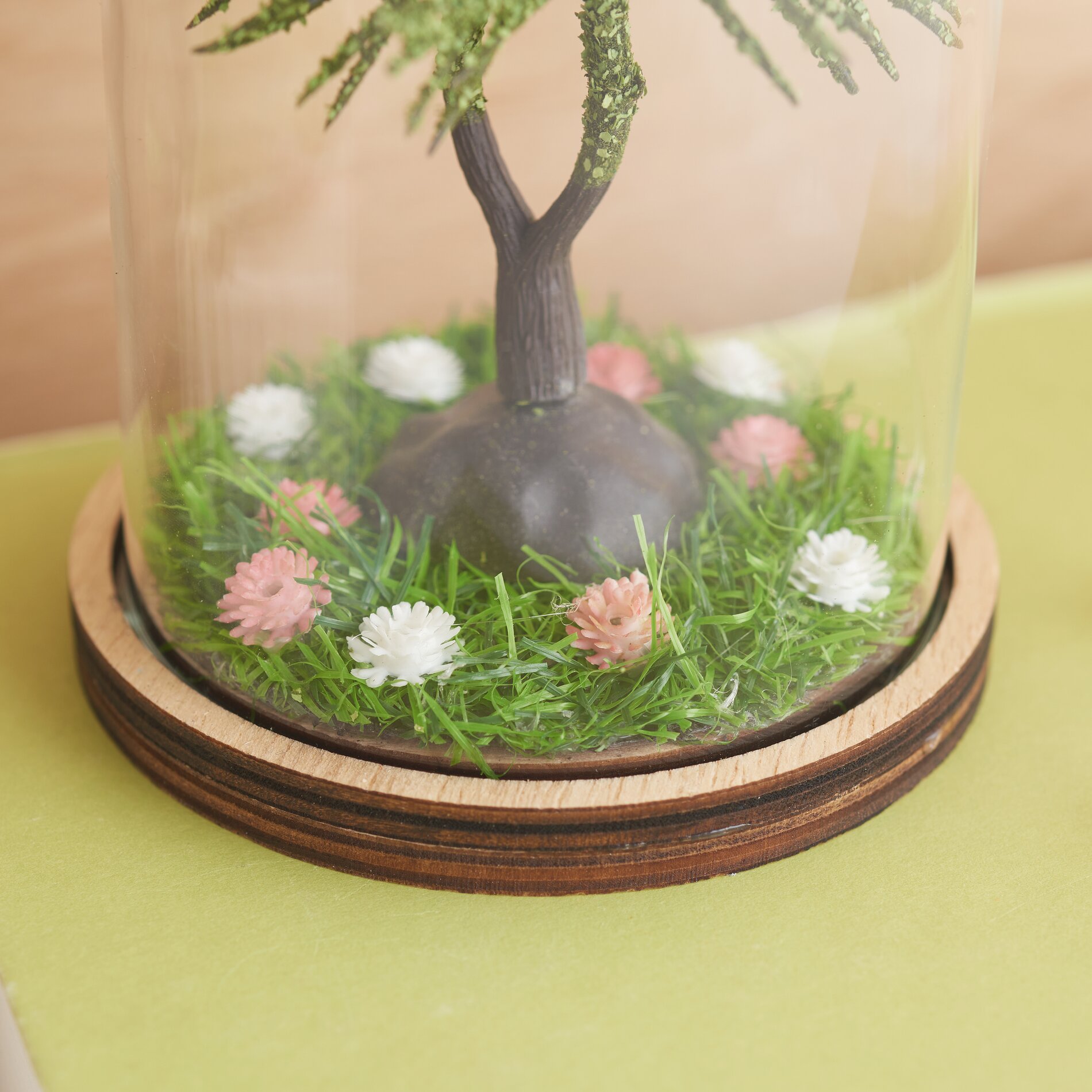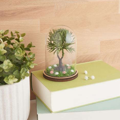 Plaats nu de miniatuurboom in het midden van de grasmat en zet hem vast met hete lijm zodat hij stevig en stabiel onder de glazen afdekking staat.