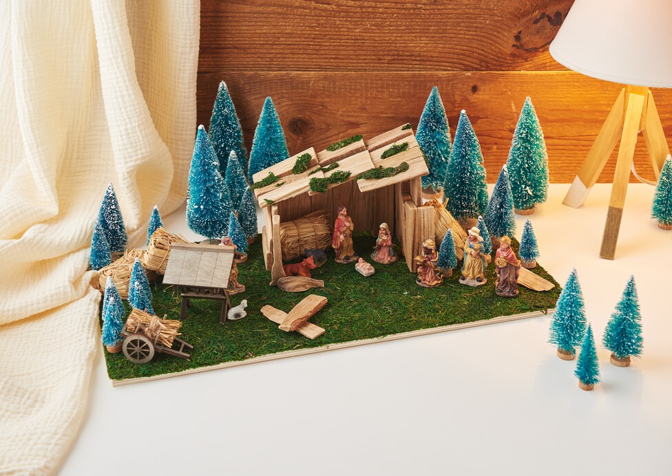 Zodra de structuur van je kinderbed op zijn plaats staat, kun je beginnen met het bevestigen van de decoratieve elementen. Lijm nu de kerststal, strokar, de kribbe, de baal stro en de dennenbomen op de gewenste plaatsen. Je fantasie kent hier geen grenzen - ontwerp het landschap naar eigen smaak. Plaats vervolgens de figuren om het tafereel tot leven te brengen.