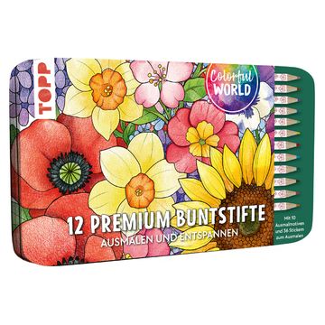 Bring your creativity to life with the Colourful World design box with 12 coloured pencils! This enchanting metal tin contains 12 premium colored pencils that make every work of art shine with their particularly soft lead and brilliant colors. Be inspired by 10 floral coloring motifs and 36 flower stickers that are just waiting for you to create them.