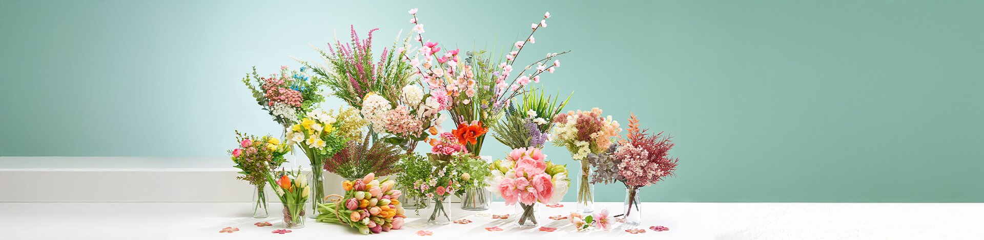Our artificial flowers are made of plastic. You can get our artificial flowers and plants for your floristic projects in many different colours and shapes. They have a wonderful look and feel. Of course you do not have to water our artificial flowers. As is well known, you can get along wonderfully without water. These flowers are simply fun.