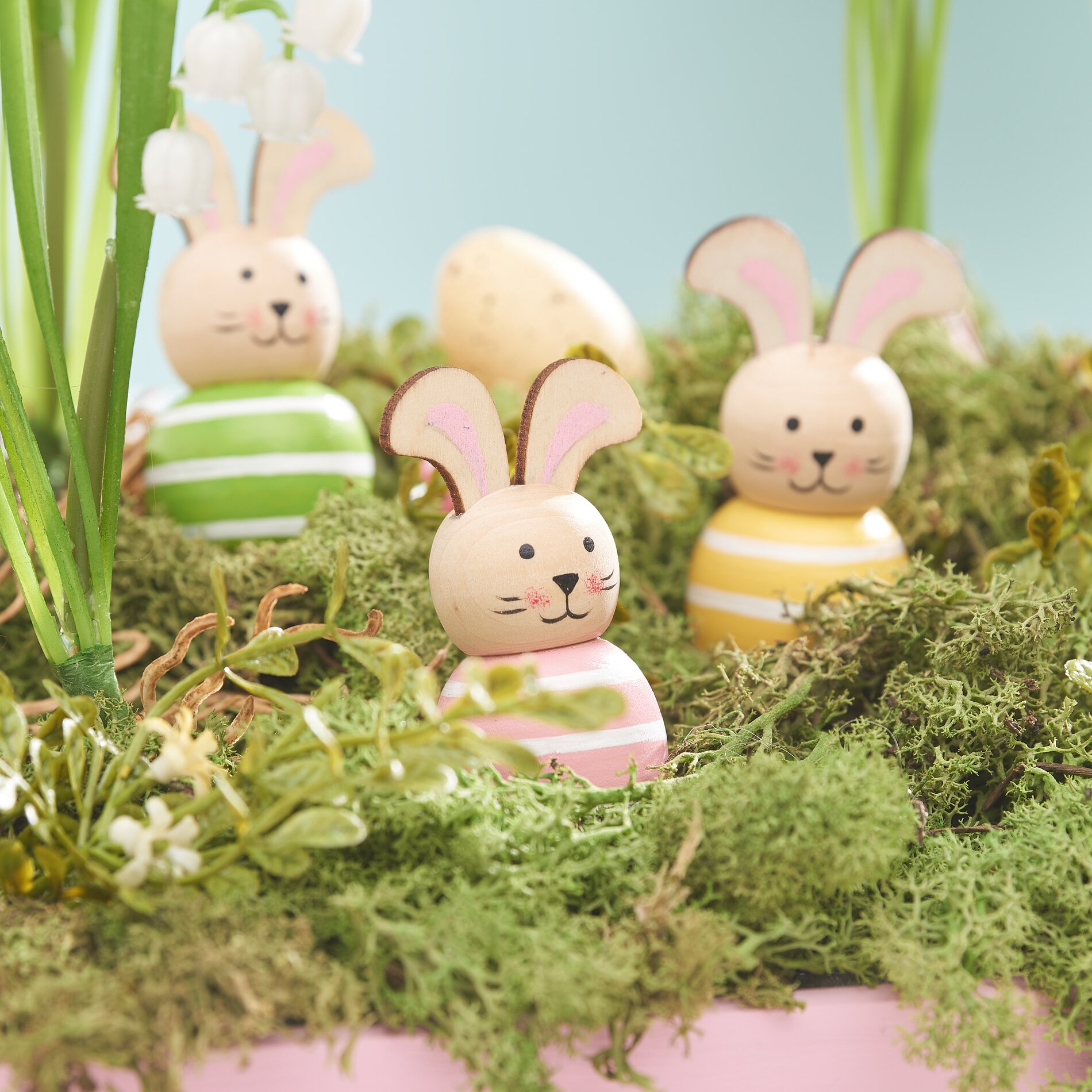 Place small easter eggs and bunnies in the arrangement. To ensure that everything holds well, fix them and individual small flowers in place with a little hot glue.