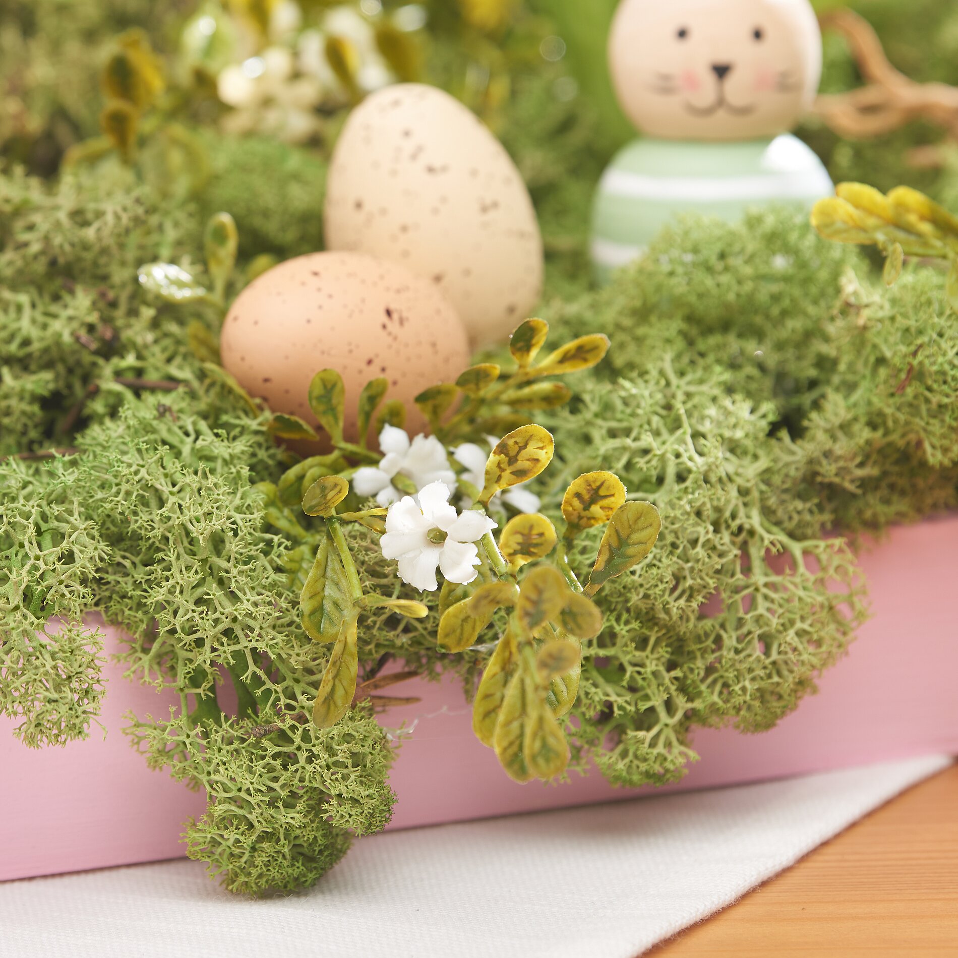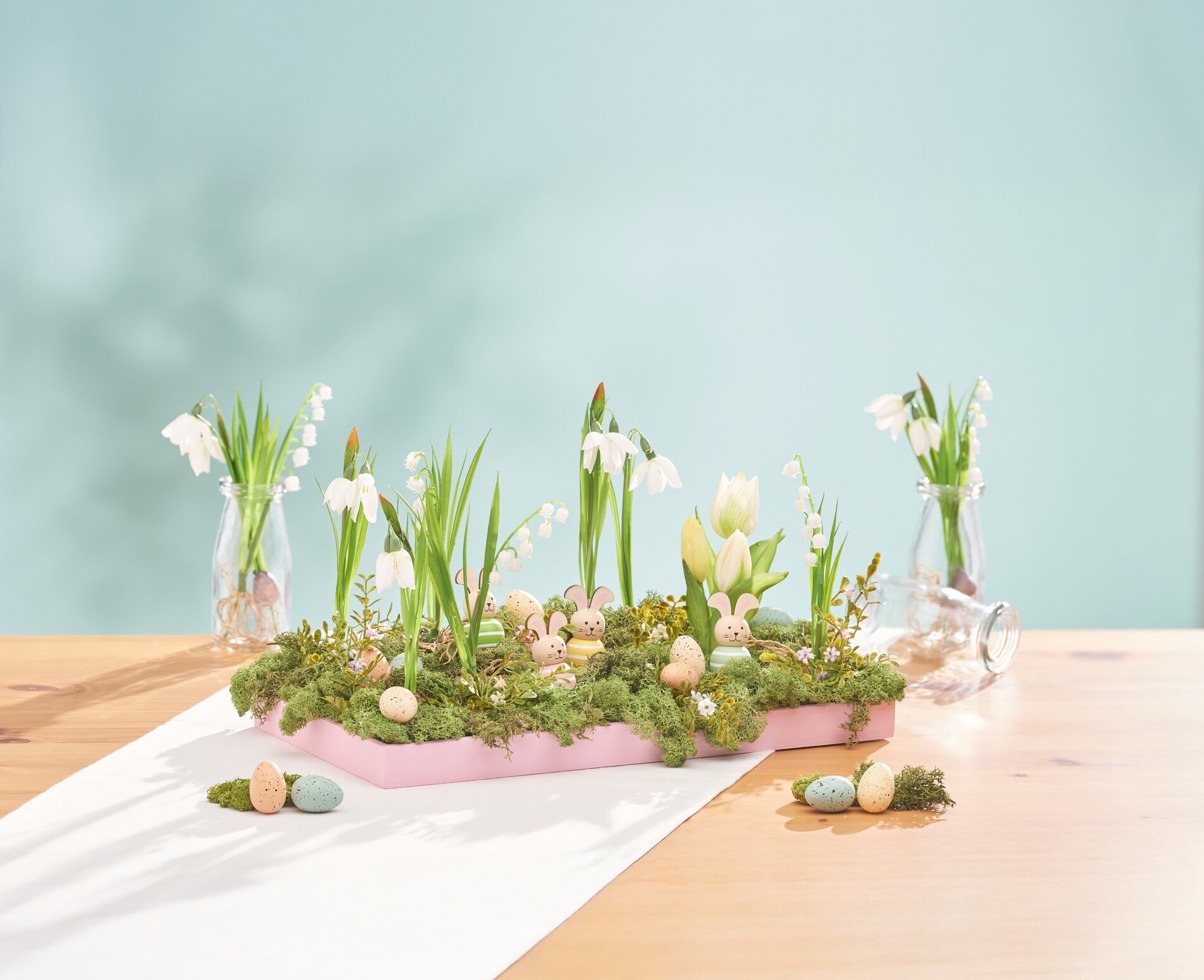 Once the paint has dried, cover the inside of the tray with flower arrangement foam:. Fix it with some hot glue and press it firmly onto the surface. Cover the flower arrangement foam with moss, so that it is completely covered. Now arrange the lilies of the valley, flower picks, tulips and snowdrops in your arrangement: simply insert the artificial flowers into the at the desired position Position into the flower arrangement foam , cutting them to the perfect length beforehand if necessary. You can create a lively and dynamic arrangement by varying the heights and colors of the flowers.