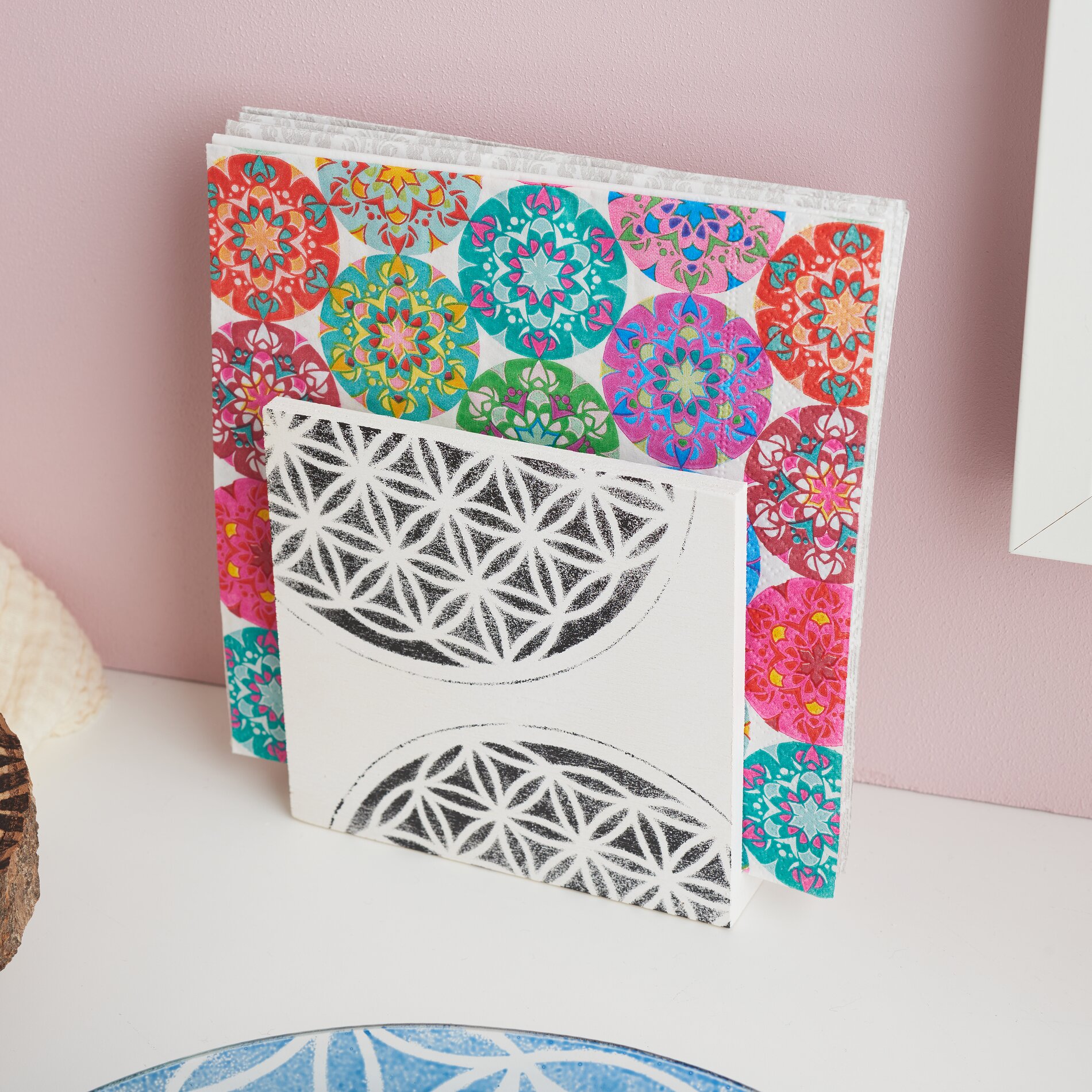 Paint the VBS napkin holder completely with handicraft paint and allow everything to dry well. Then apply spray adhesive to the back of the stencil , place it on the napkin holder and press it down firmly.