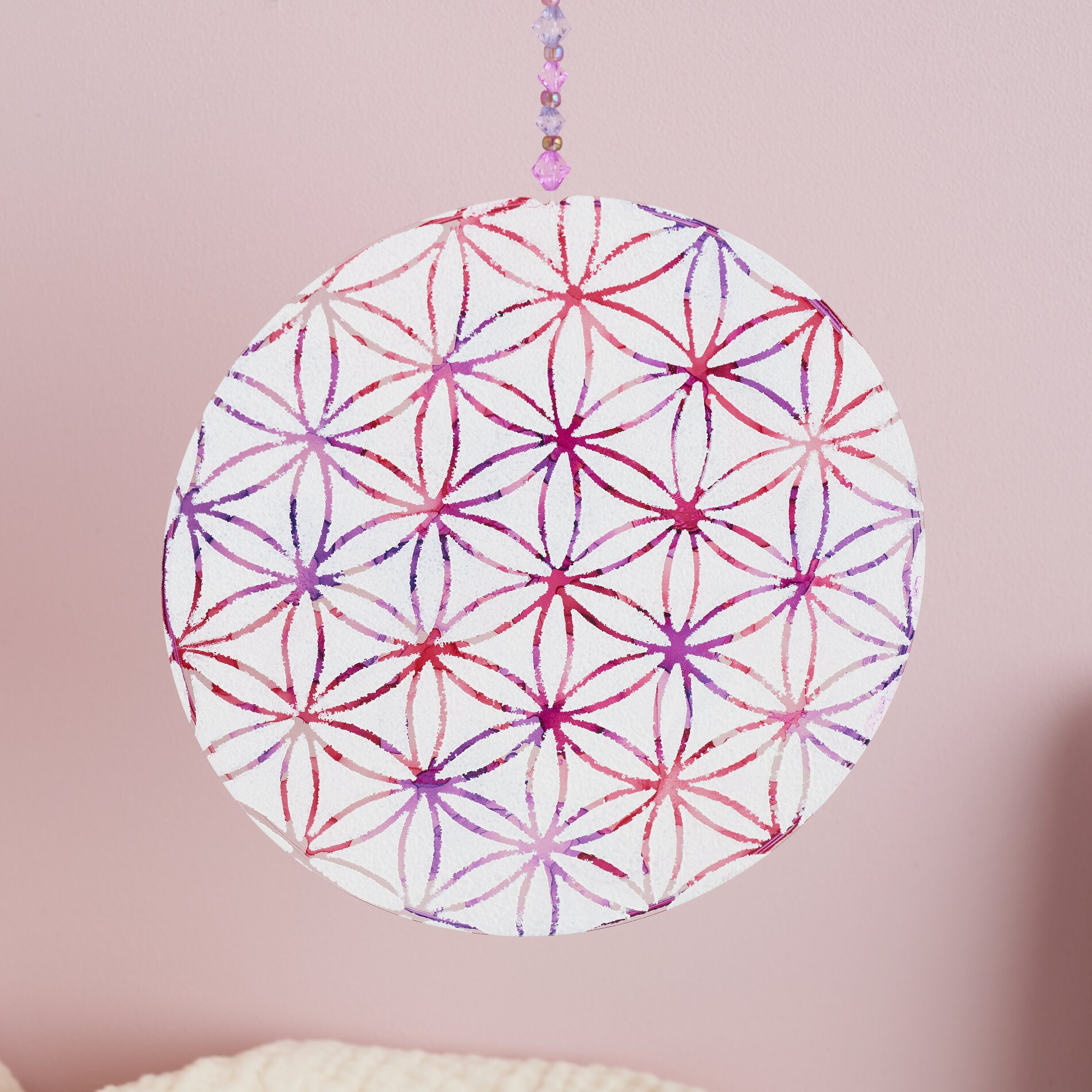 Turn the pane over and apply the stencil with spray adhesive to the untreated side. Dab the motif with handicraft paint , remove the stencil and clean it immediately. Once dry, drill a small hole in the acrylic disc. with a hand drill, thread perlon thread through it, string beads as desired and knot the ends together - your decorative eye-catcher is finished.