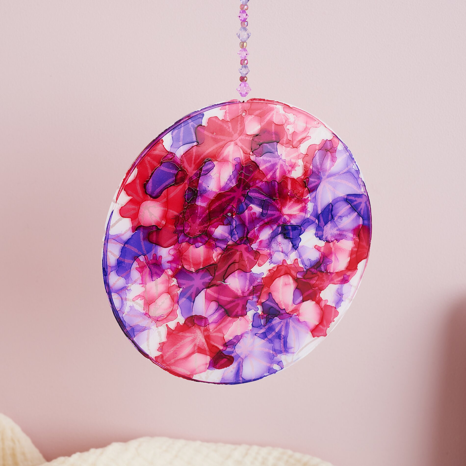 First design one side of the round acrylic-separating and painting disk with Alcohol Ink. Put a few drops of ink on the surface - it will spread by itself. Place other colors next to it so that they displace each other and create exciting color effects. By blowing lightly, you can move the ink and create softer color gradients. Leave the surface to dry completely.