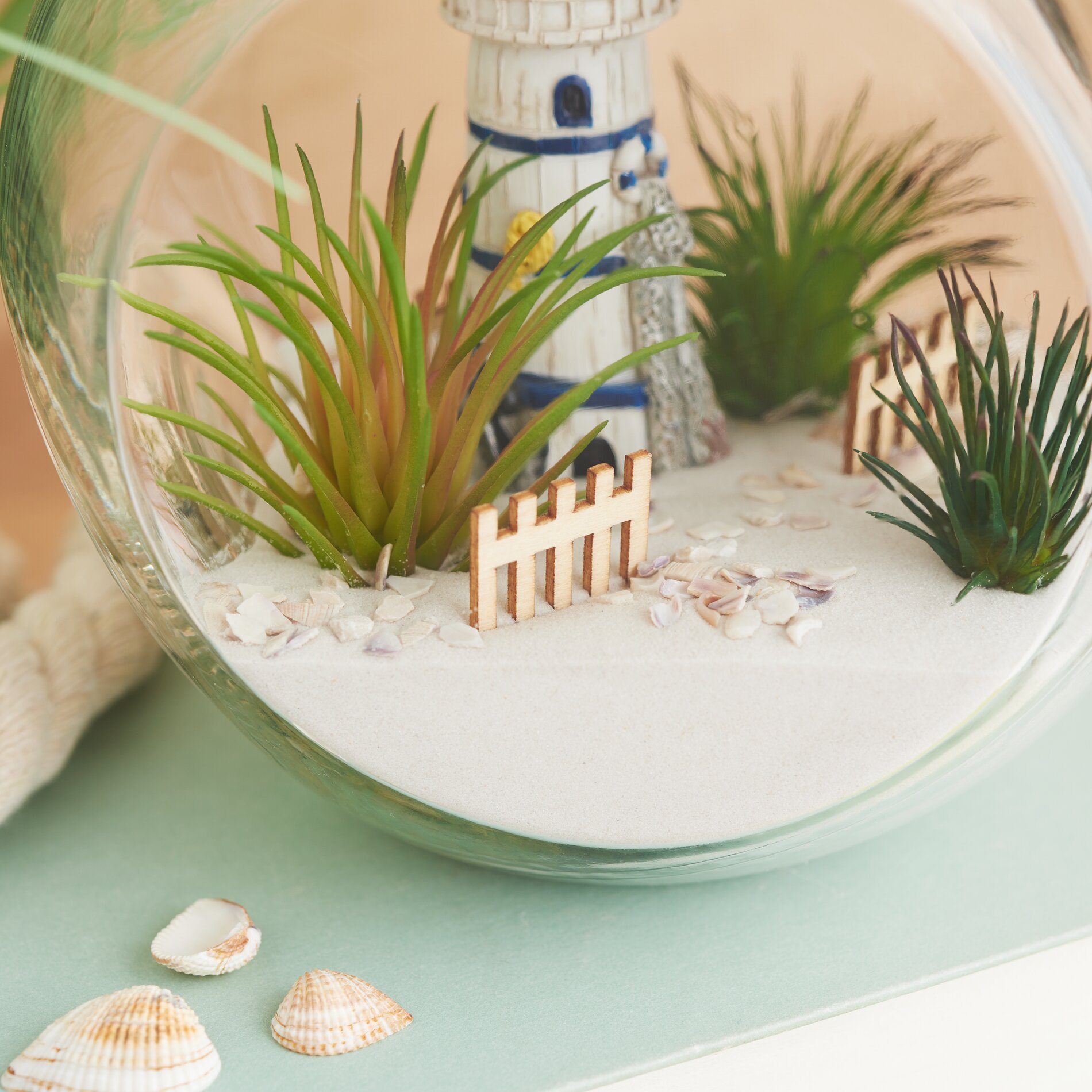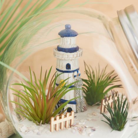 Take the side cutter and cut the stems of your succulents to a length that allows them to stand upright in the glass. Then place them in sand, so that they are stable and look good. Add other accessories to complete your lighthouse landscape: place small fence elements in the sand and sprinkle shell granules on the sand surface.