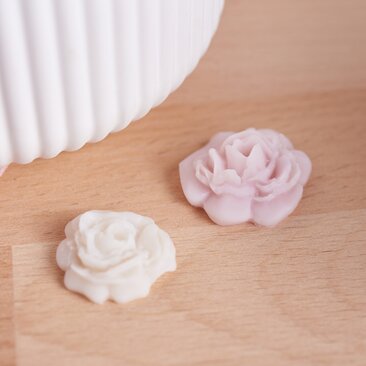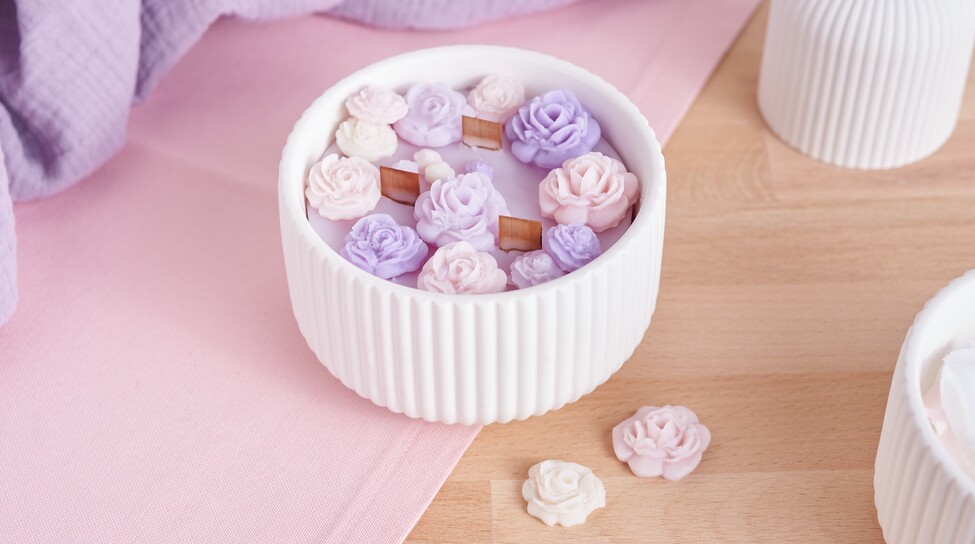 Now carefully fill the bowl with the liquid wax so that the wicks remain firmly in the bowl. Melt some more wax and pour it into a silicone mould for rose petals. After about 10 minutes, you can carefully remove the wax elements. Once they have completely hardened, place them on your candle bowl as desired.
