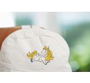 Pretty VBSkids backpack made of 100% cotton. The size is about 21 cm x 23 cm with a depth of about 7 cm. The carrying strap width is approx. 2.5 cm and the strap length is approx. 42.5 cm with buckles for adjustment. The buckles are made of plastic. The opening with zipper is approx. 38 cm large. On the front side there is a small bag, approx. 13 cm wide and approx. 11.5 cm deep, with a concealed zipper. It offers additional space for small things. The rucksack is of high quality and excellent workmanship.