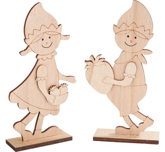 You get two enchanting figures that are ideal for decorating with paints, pastes, papers or sprays. The arms with strawberry and basket are separate and are glued on with craft glue (not included). This makes it easier to paint the body. After decorating, simply stick them together and fix with a little craft glue if required - and you have a unique eye-catcher.