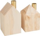 Discover the magic of details with our wooden houses with holder for stick candle. These charming candle holders are not only functional, but also an eye-catcher in your home. The set consists of two wooden houses of different sizes, which create a warm atmosphere with their natural look and gold-coloured metal cups for tree candles.