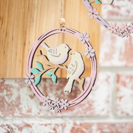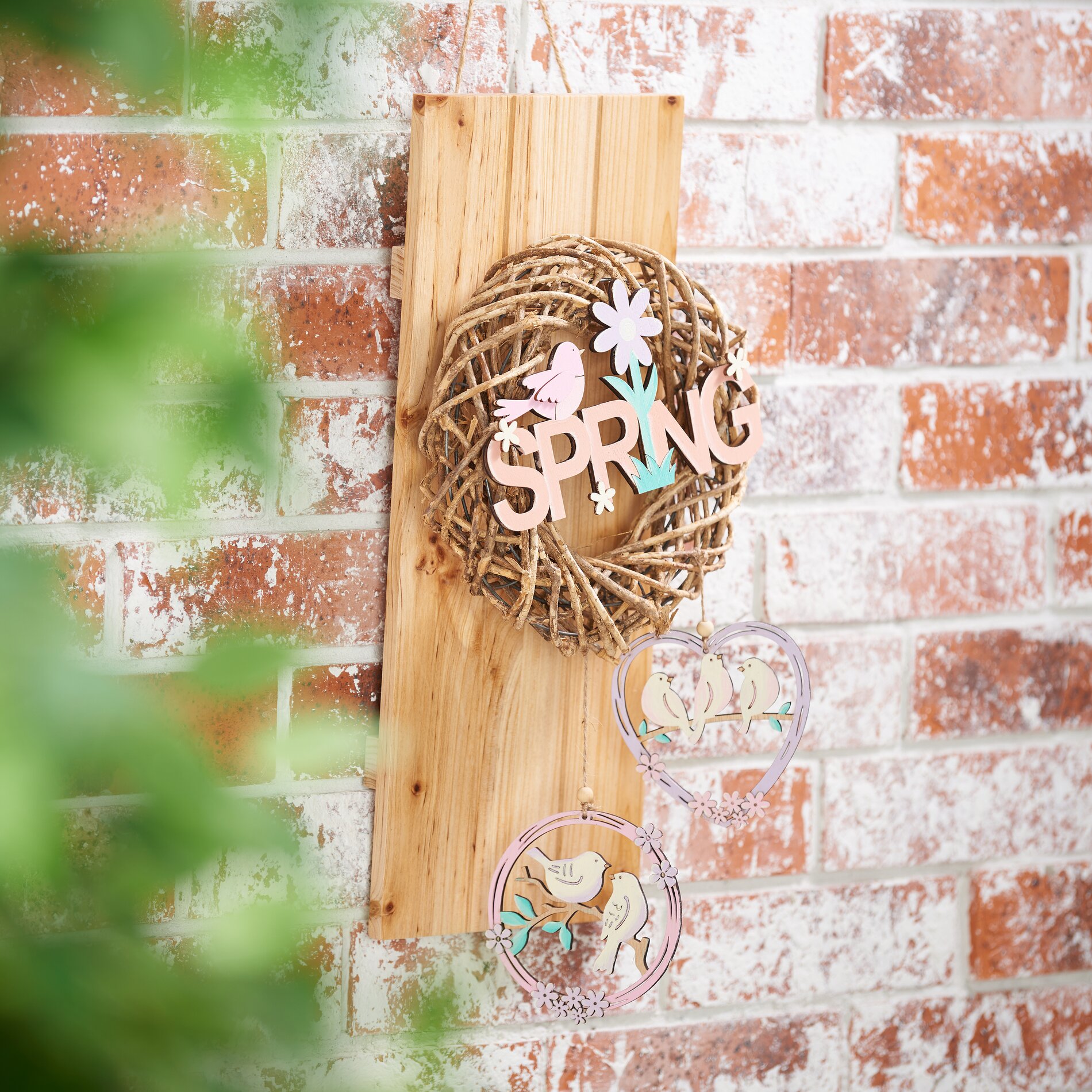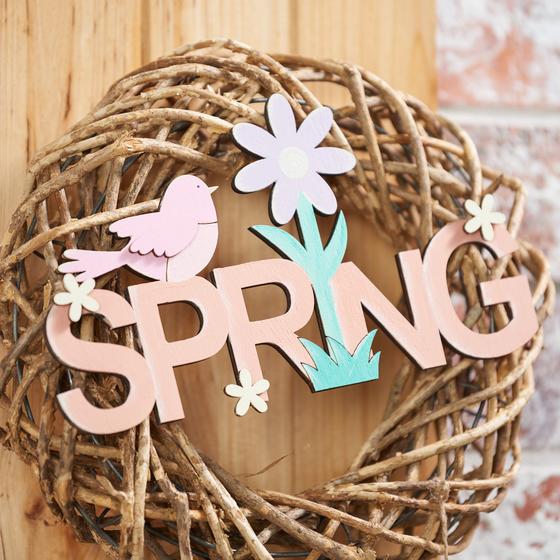 Nu de krans hangt, kun je de houten letters en de beschilderde houten hangers aan de krans knopen.