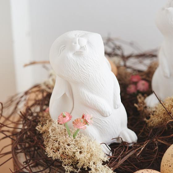 Nu is het tijd om je zelfgemaakte konijntjes op de voorbereide decoratieve plaat te plaatsen. Gebruik een sterke lijm om ze stevig op hun plaats te houden.