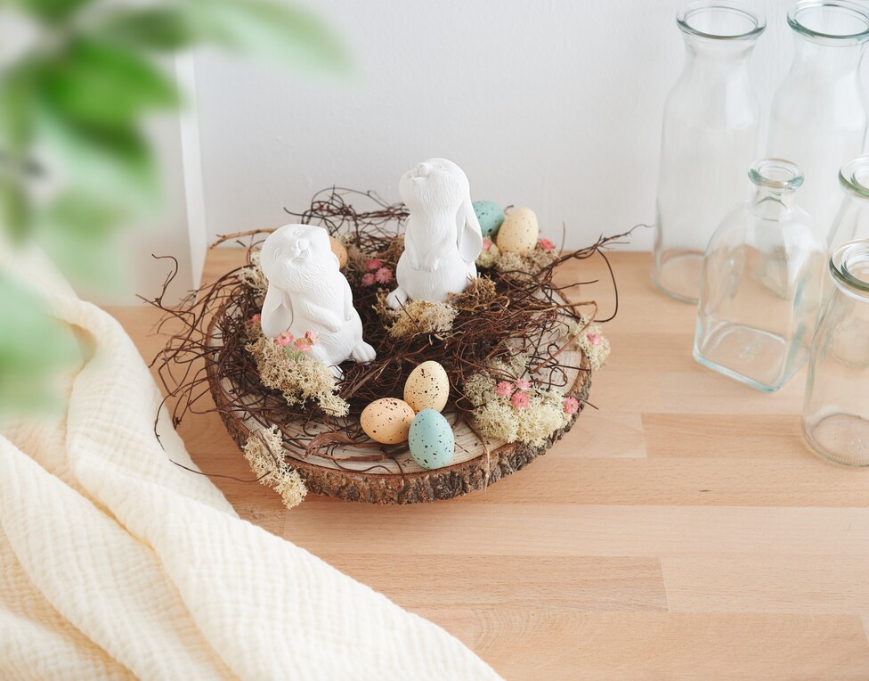 Gebruik een schaar om de gipskruid op de gewenste lengte te knippen. Lijm de gipskruid en decoratieve eieren decoratief op het houten paneel. Spreid ze gelijkmatig uit voor een harmonieus geheel. En klaar is je mooie paasarrangement!