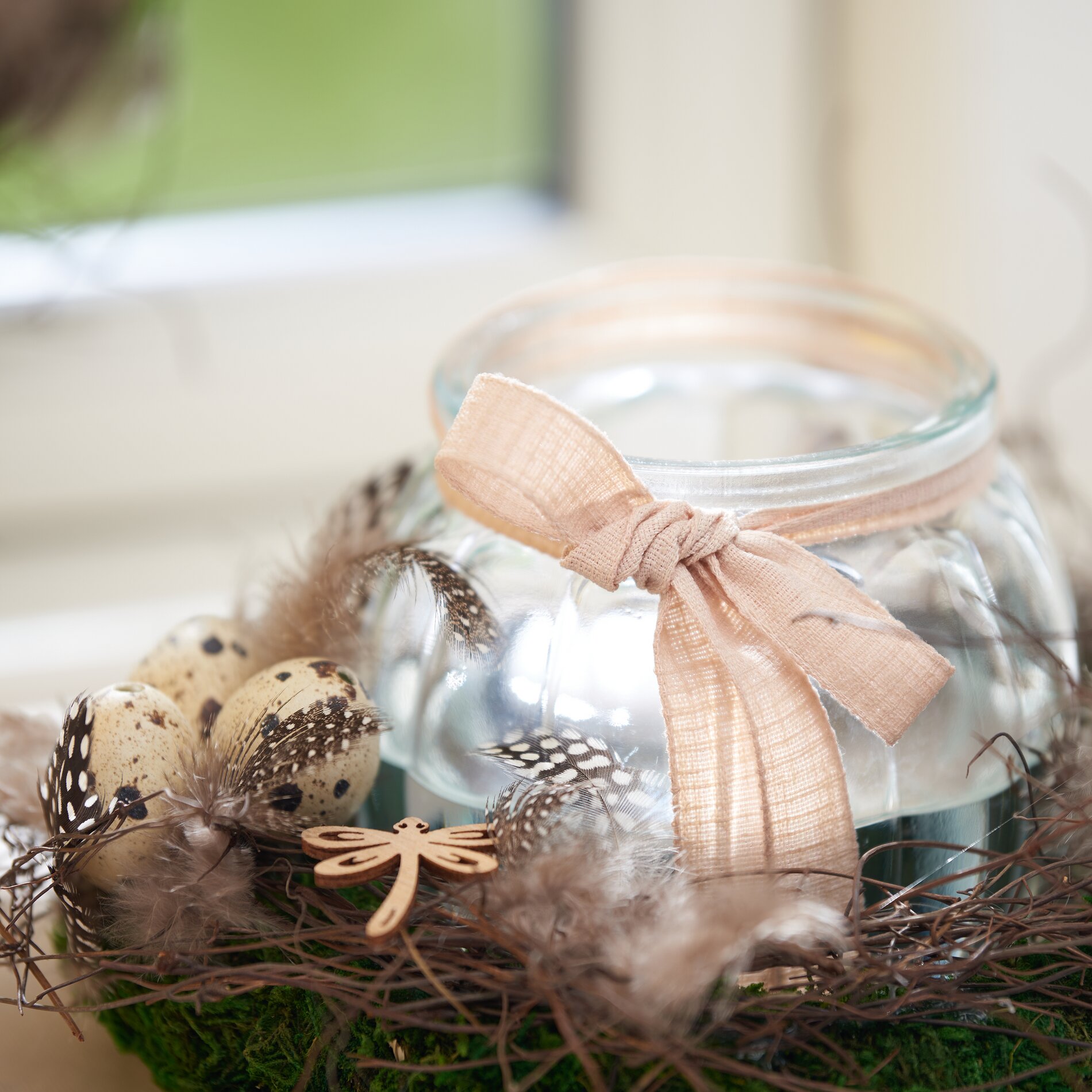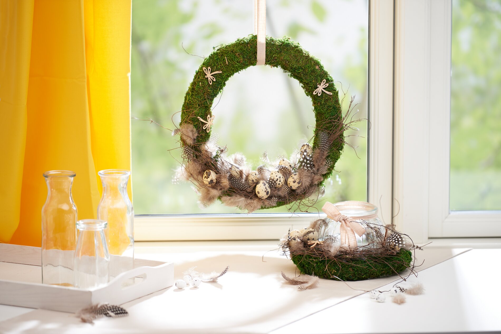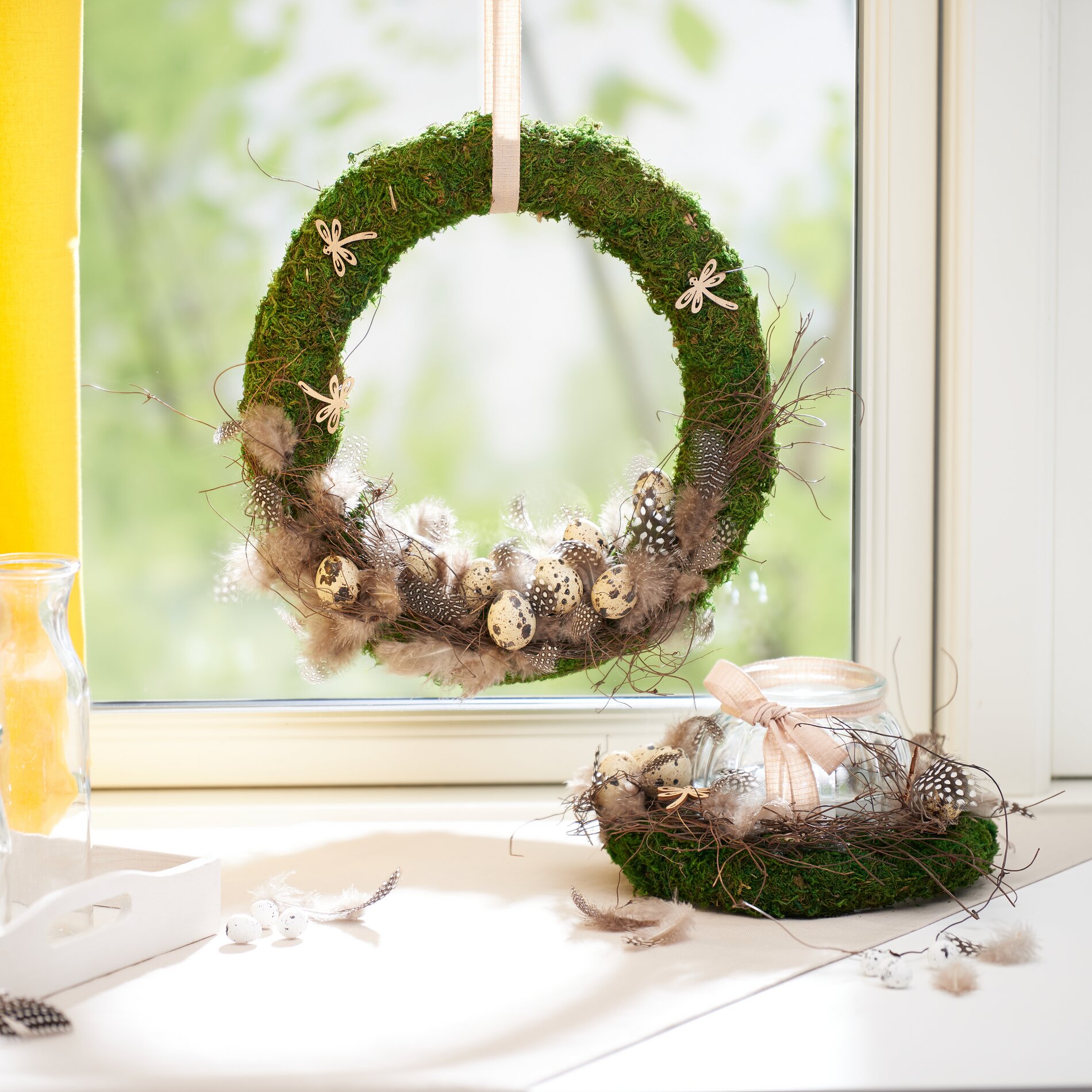 Dit idee is een goed voorbeeld van decoratief knutselen met natuurlijke materialen voor de paastijd. Moskransen, decoraties-wilg en meer brengen de magie van natuur direct in je huis. Laat je inspireren en maak je eigen natuurlijke paasdecoraties met onze materialen!