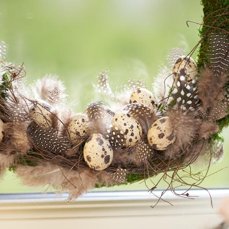Plaats de kwarteleitjes voorzichtig op de decoratie-wilg. Steek natuurlijk veren in de krans. Versier met de houten hagelslag of andere natuurlijke materialen. bevestig ze met hete lijm. Lijmdraden of te veel hete lijm kun je verwijderen zodra de lijm is afgekoeld.