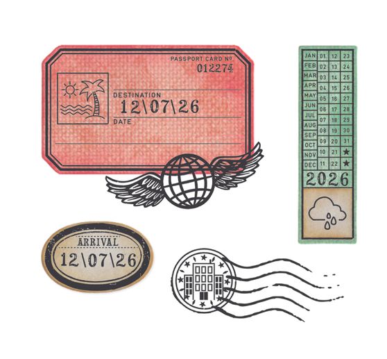 Sizzix Framelits Ponssjabloon en Clear Stamps "Globetrotter’s Mark by 49 & Market"