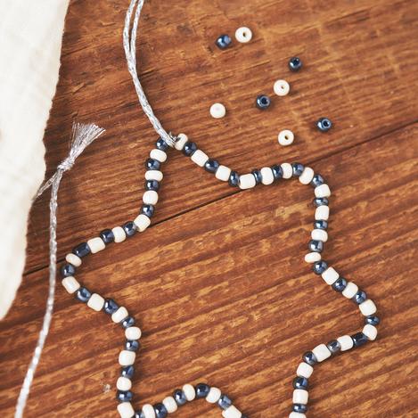 Nu komt het creatieve gedeelte: rijg kralen naar wens aan de draad. Kies de kleuren en maten die je mooi vindt en speel met verschillende patronen om je ster een individuele look te geven. Rijg niet te strak, zodat de draad flexibel blijft.