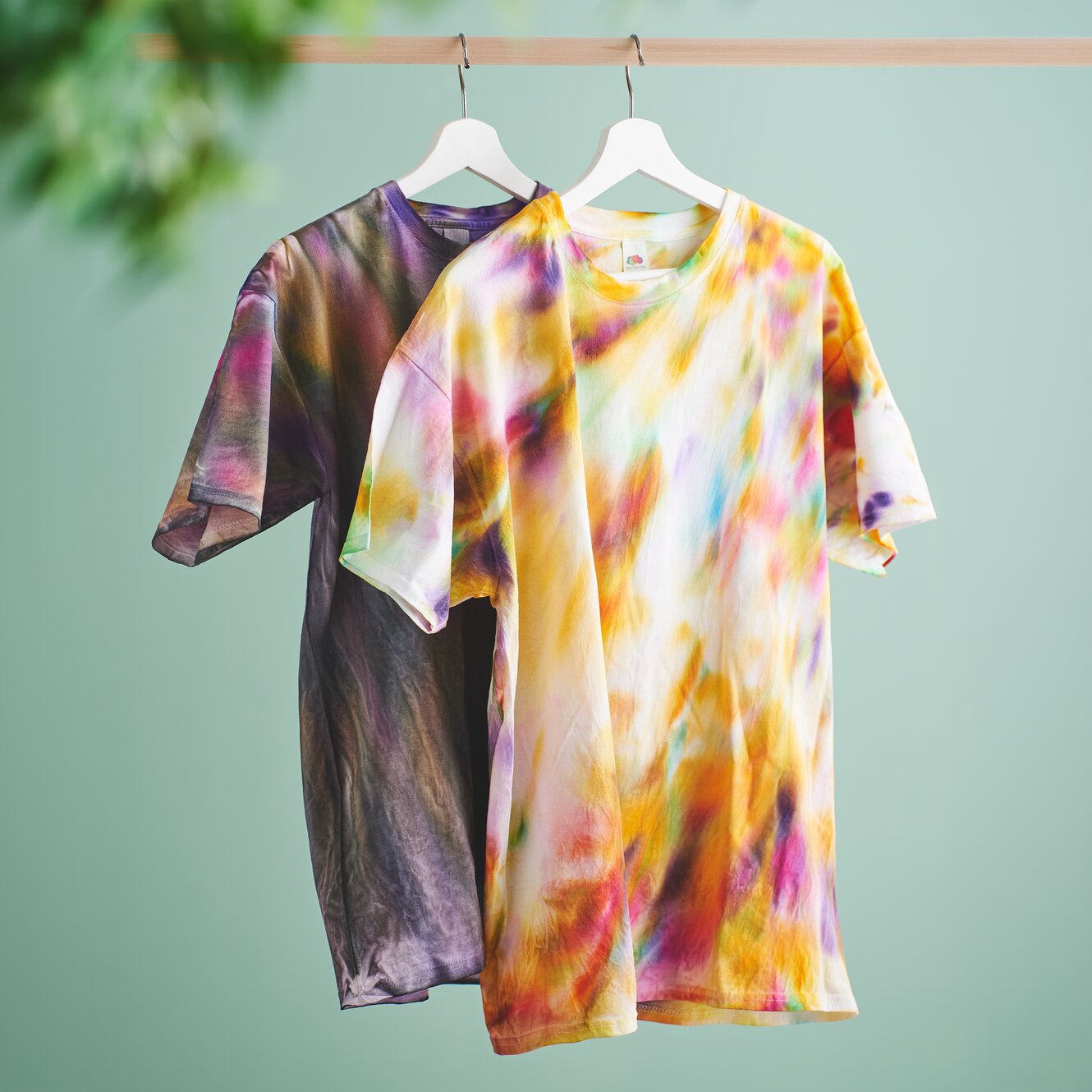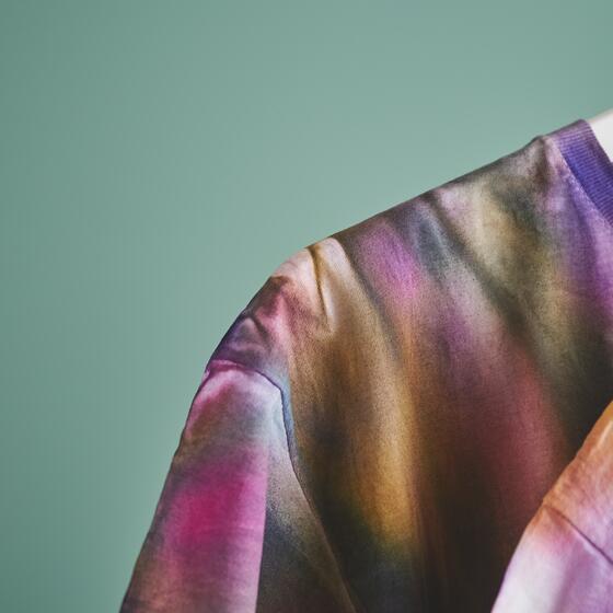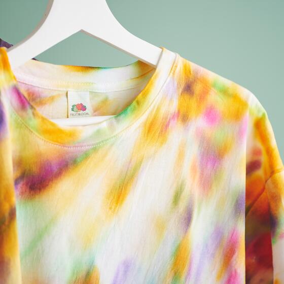 Vouw het T-shirt na het verven voorzichtig open. Trek niet hard aan de stof om de kleurovergangen te behouden. Hang het T-shirt vervolgens op en laat het volledig drogen. De kleur kan pas worden gefixeerd als de stof helemaal droog is.