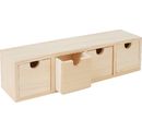 Deze rechtlijnige houten plank met 4 inschuifbare kisten is perfect om te decoreren en te ontwerpen. Door de rechte vlakken van de ladekast kunt u plastic motieven zoals knopen, sierknoppen of zelfs schelpen verlijmen. U kunt deze plank individueel gebruiken of combineren met meerdere