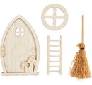 De set bestaat uit een charmante houten deur met paddenstoelmotieven, een rond raamkozijn, een houten ladder en een bezem - perfect voor het maken van betoverende kabouterdeurscènes, elfenwerelden of gedetailleerde miniatuurlandschappen.
